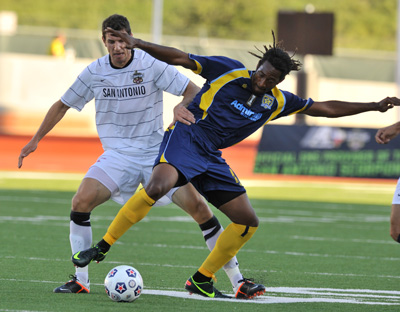 Aaron Pitchkolan and Amani Walker tussle for control of the ball in Sunday night’s regular season finale of the 2012 NASL season.